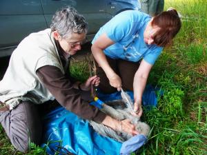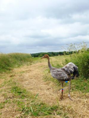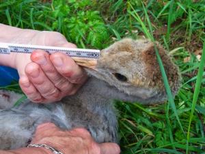 Capture methods were varied but generally involved either a stake-out (hiding out from dawn in woodland edges and field crops waiting for the birds to emerge from their night-time sleeping places) and surprise attacks (driving along small tracks and lanes early morning and surprising the adults feeding in the hay meadows and arable crops). Once located - the basic method is to run after the chicks before they make it to dense cover to hide. They are pretty quick – but not as quick as a reasonably fit human being! After approx 32 hours of work over 4 days we managed to successfully capture and ring eight young cranes - all aged 6-9 weeks old. These were weighed and measured and fitted with 6 colour-rings above the ‘knee’ and a metal ring below the ‘knee’ before being released back into the landscape.