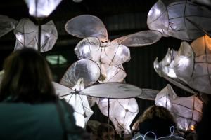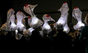 The performance took place during The Willow and Wetlands Christmas Craft Fayre and started with a procession of dragonfly lanterns and crane head-dresses sported by the children of North Curry and Stoke St Gregory primary schools. Headed up by two amazing willow crane sculptures. All of this was supported by the Big Noise Street Band who really did live up to their name!
